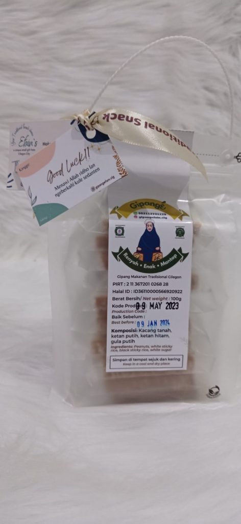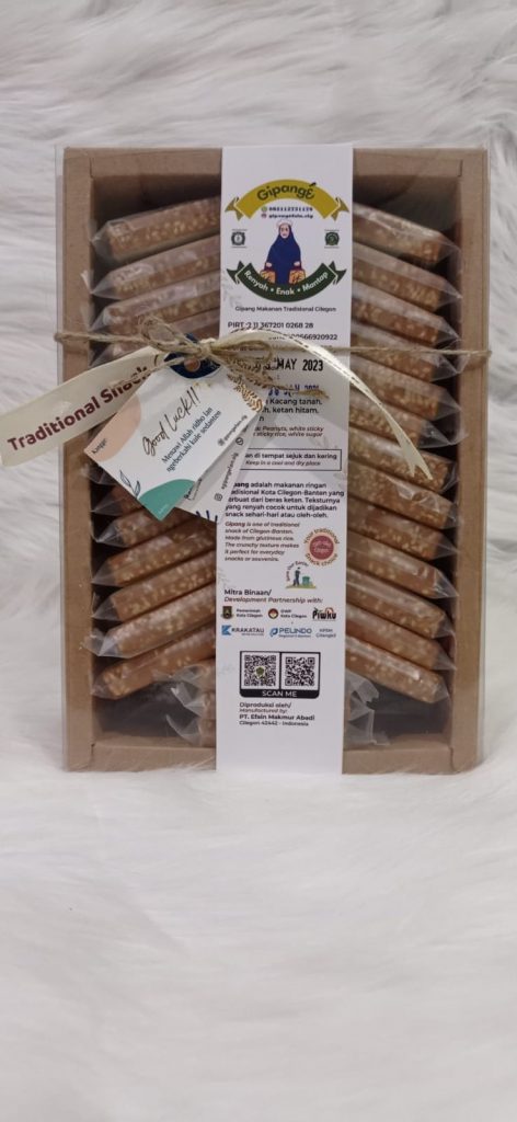 Gipang yang di produksi oleh UMKM Gipang’E ini merupakan snack tradisional yang dikemas modern, dengan berbagai bentuk unik dan lucu yang tentunya sangat menarik untuk di berikan sebagai oleh-oleh ataupun Souvenir untuk sanak saudara, teman, atau rekan kerja baik yang ada di kota Cilegon maupun yang diluar kota.